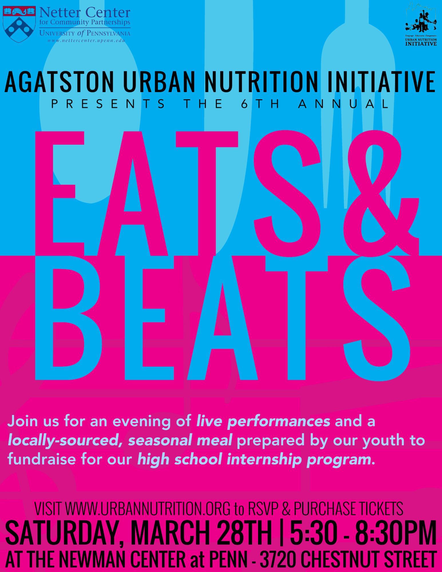 Eats and Beats is a community event including a locally-sourced, seasonal meal prepared by our youth interns, performances by our youth and local artists and a silent auction. Guests will be treated to a 5-course meal featuring ingredients donated by local farms, restaurants and businesses. Our youth are part of a national network of young leaders in food systems reform who are helping to grow a movement to build local, socially just food systems that nurture personal and environmental health. Join us on March 28th at the Newman Center at Penn (3720 Chestnut Street, Philadelphia, PA 19104) for a meal prepared and served by our youth!